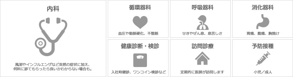 風邪やインフルエンザ、胃腸炎、ぜん息、糖尿病など生活習慣病の治療などの一般的な内科の病気はもちろんのこと、
